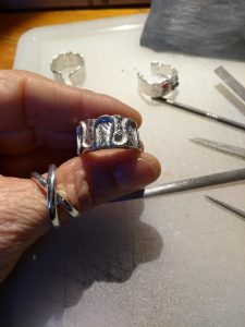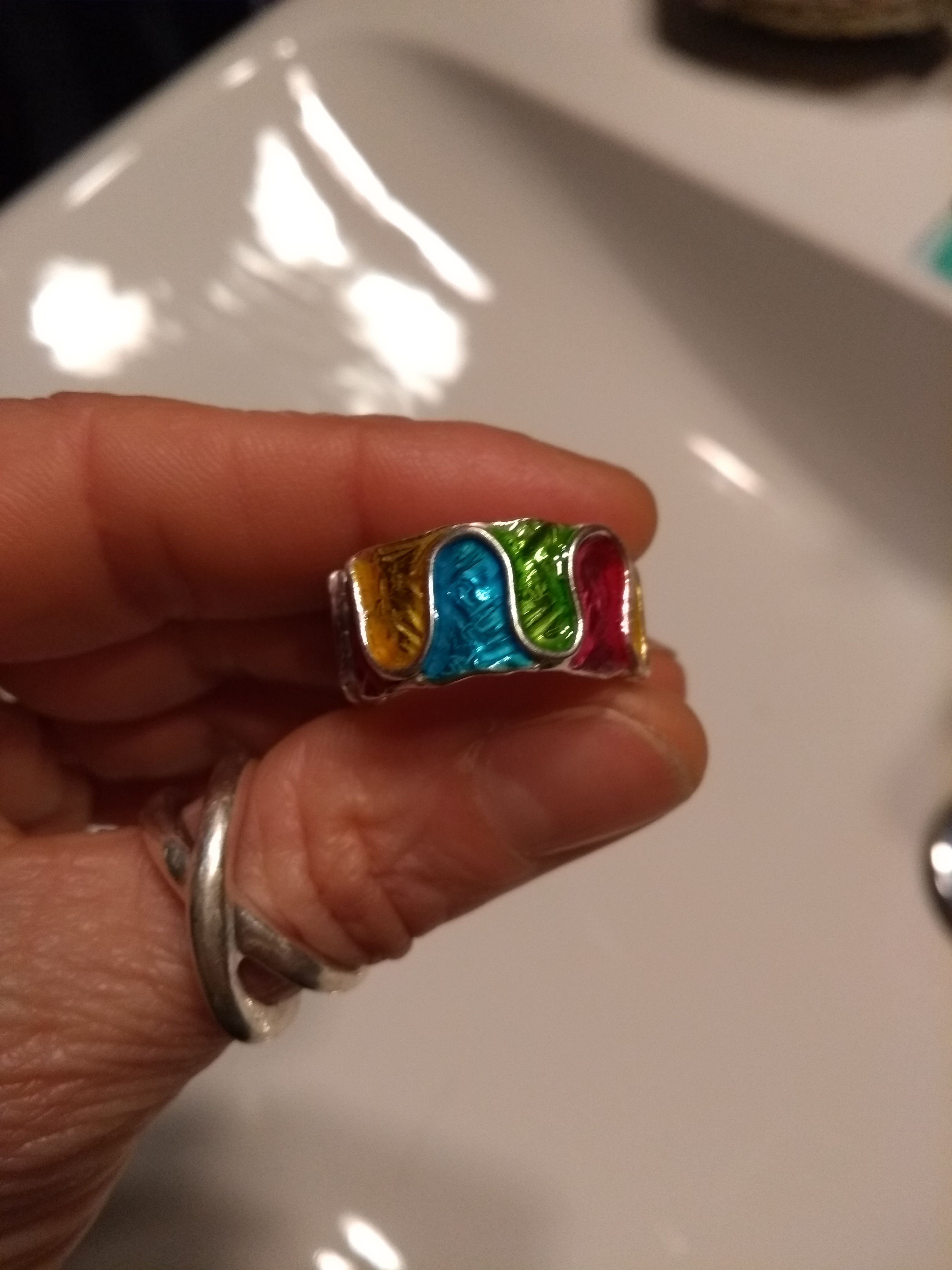 Anello a fascia di argento massiccio decorato con un motivo in rilievo ad onde e smaltato con tutti i colori dell’arcobaleno. La lavorazione della fascia resta visibile sotto gli smalti trasparenti e crea un effetto molto particolare. La mia proposta è colorata ma se preferisci posso lasciare l’anello in argento naturale. Su ordinazione, puoi scegliere i tuoi colori preferiti.