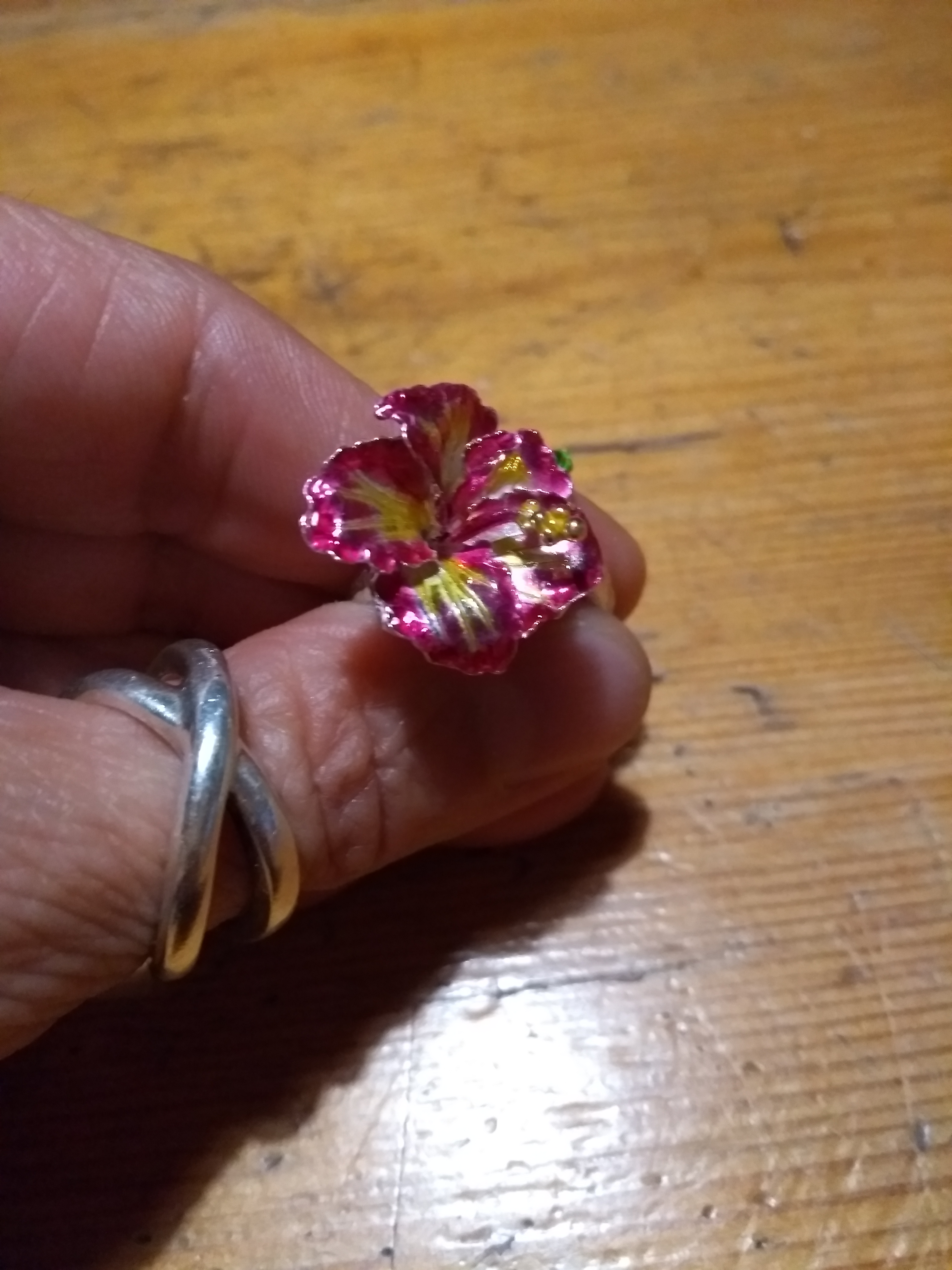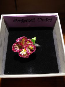 Anello a forma di fiore, la sua particolarità è che riproduce fedelmente la corolla di un fiore di ibisco il cui stelo si avvolge attorno al dito formando l’anello stesso. Pezzo unico non riproducibile. Se ti attrae l’idea possiamo studiare insieme un fiore che ti piace. (nella terza foto modello in cera dell’anello)