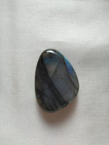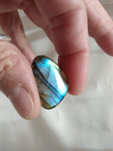 La labradorite è una pietra misteriosa, alla luce piena sembra insignificante, di colore grigio verde, ma appena ti avvicini e la ruoti leggermente ecco che appaiono mille sfumature blu, improvvisamente si anima di piccoli bagliori che sembrano venire da dentro la pietra.